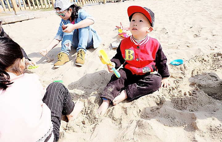 我脱了鞋到沙子上边玩,爸比跟宝宝在亭子里看着,就这样看着看着宝宝就决定也走出亭子,跟我一起玩。