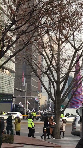 大概五点的时候就开始游行了 据说六十万人 不得不说韩国人心真齐 而且这一天还是bigbang演唱会 哈哈哈哈家 可是我们专爱免税店