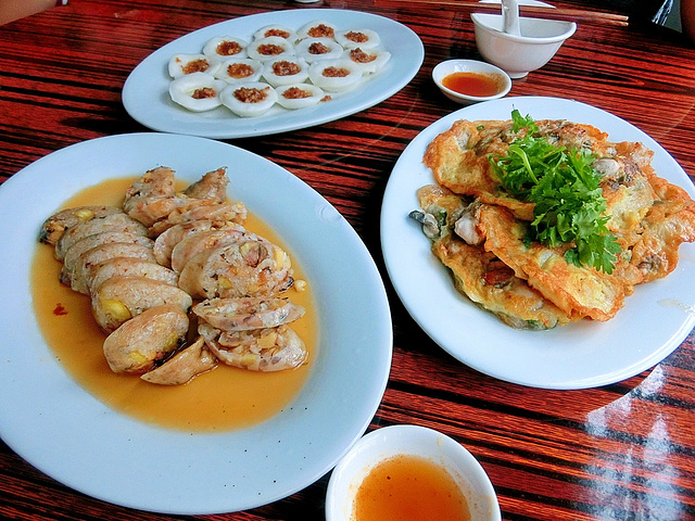 猪肠糯米,蚝烙,咸水果均为潮州特色小吃,还有牛肉丸,不过牛肉丸就没有拍啦,牛肉丸一般做成汤,当时请同学吃的时候没有点汤来着,奔着小食的。香港兄就不一样了,几乎每走到一家卖牛肉丸的都要买来吃出每家不一样的味道...赞不绝口