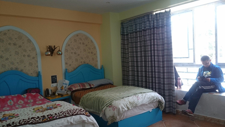 床单,被套和枕套都是自带的,感觉和家里差不多。整个客栈提供免费自行车,免费使用自助小厨房,有一台免费的公用电脑。就近出去吃了点中餐,一路上由于零食吃太多了,所以大家都不是太饿,点了几个小孩子爱吃的菜,随便吃了点,味道一般吧。回客栈后2个孩子就去电脑那里玩了,反正平时在家也很少玩电脑,出门了,就不管了,放风了。我们大人也趁机小小的休息一下。
