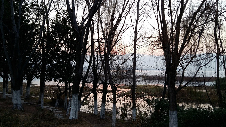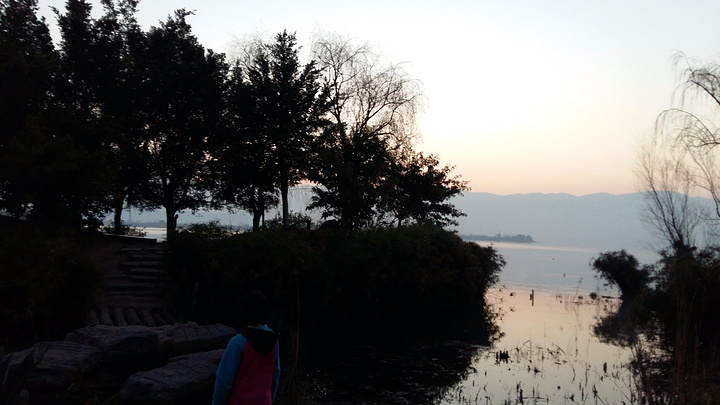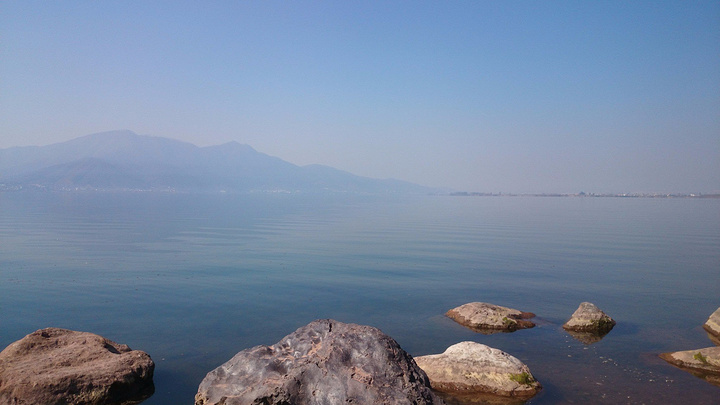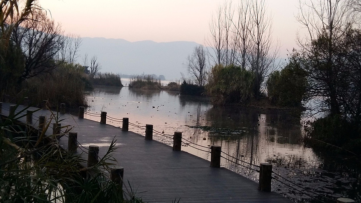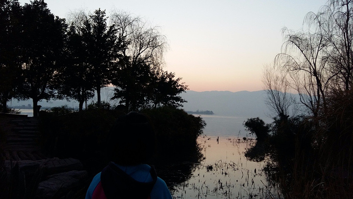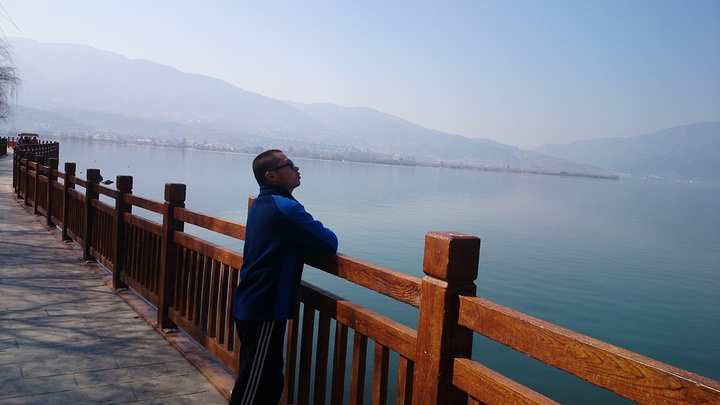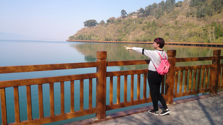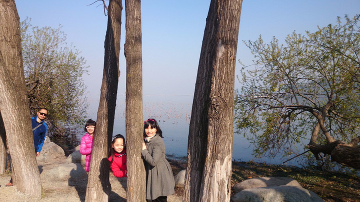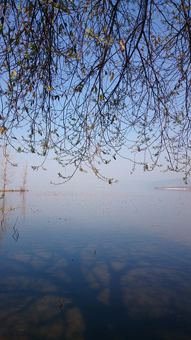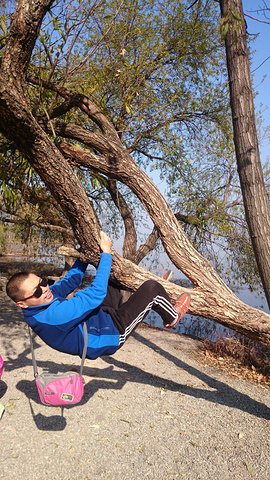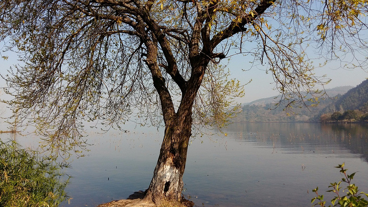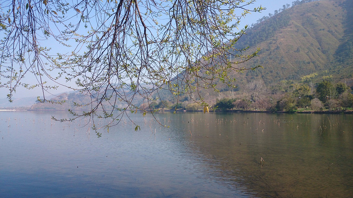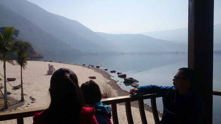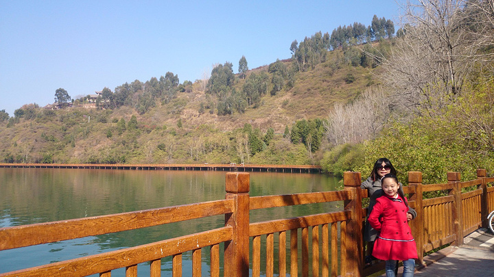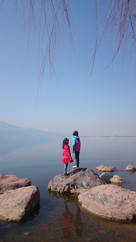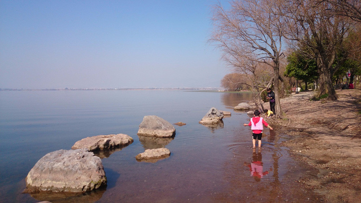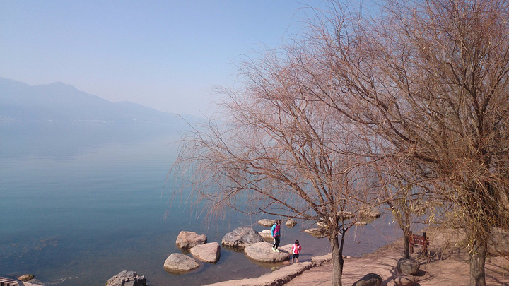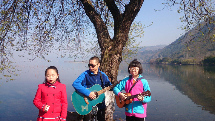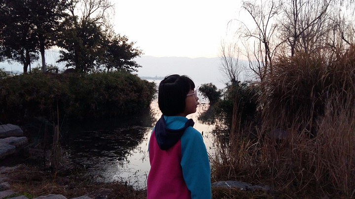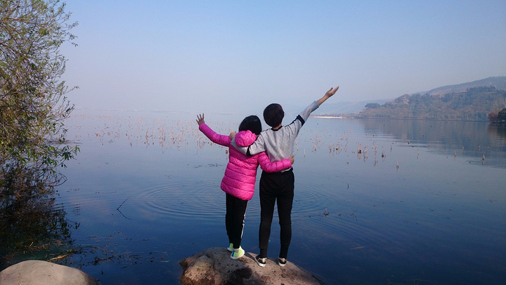 回到旅店差不多9点了,大家都洗漱整齐了,睿睿要吃牛肉粉,妈妈带她去,我早上不喜欢吃油腻的东西,就在旅店喝了点牛奶吃了点带去的点心。早饭完毕,大家已经迫不及待的想去玩了。按计划我们本来是要开车去月亮湾玩的,但是由于路上设了卡,我们的车不能再往里面开了。把车停进核桃村停车场,这里可以直接走到湖边,很近,意外的发现这里的风景很不错