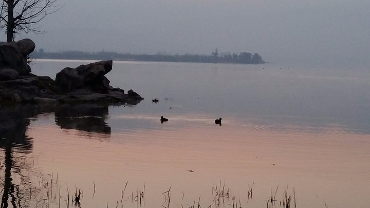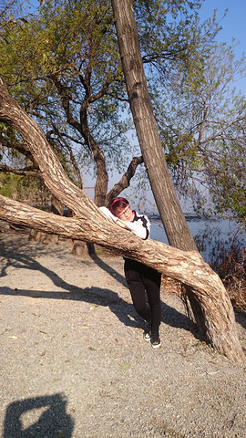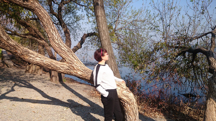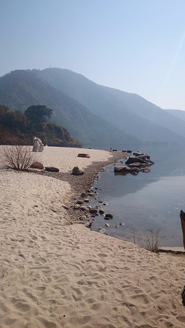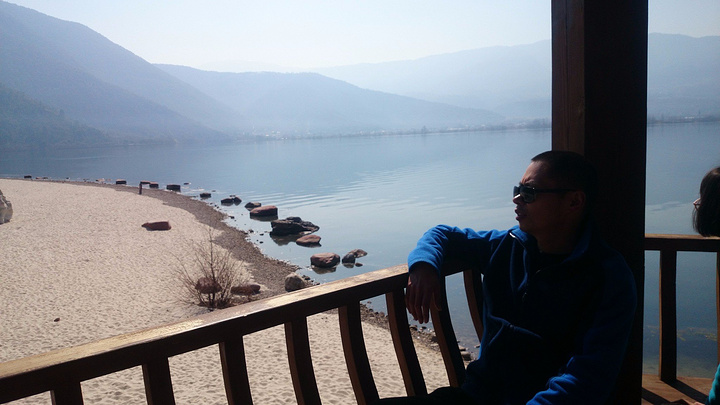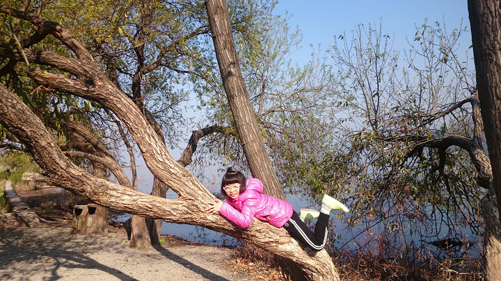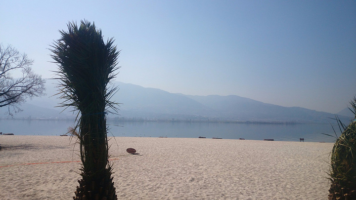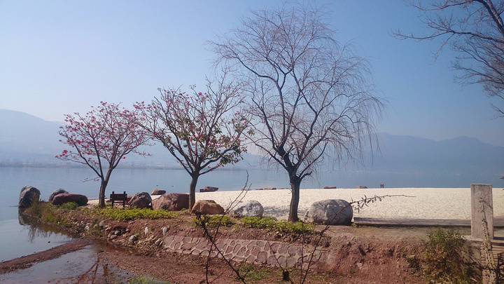 沿着湖边的栈道一路骑行,我们发现了一片很美的沙滩