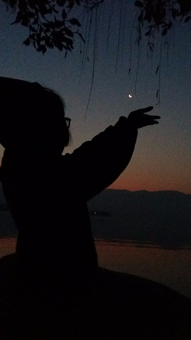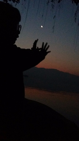 外面天还没亮,一轮弯月挂在天上。不过公园里有路灯,晨练的人也不少。跑了大概3公里,睿宝有点累了,我们就顺着湖边走走,看看,听听。