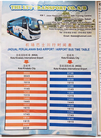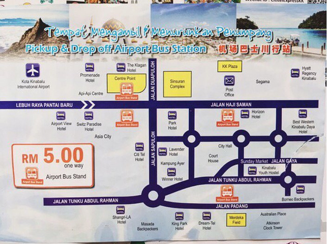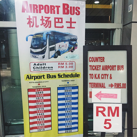 出了KK的机场发现有机场巴士,不过去市区的最后一班已经停运了。这里提供给没有租车和叫接机服务的朋友们。如果是很多人,建议在机场打Taxi更划算,在到达厅出口右手边有taxi柜台,告诉酒店名字和地址,人数,一般小车是30RM左右,大车40RM,具体价格还是依你预定的酒店距离为准。
