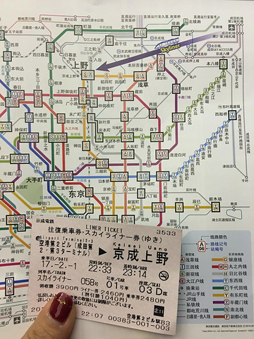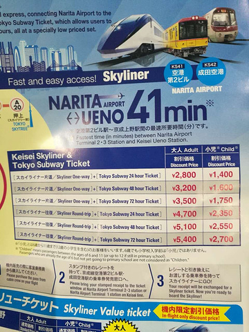 到成田机场入境过已经近10点,真怕赶不上地铁。可以买西瓜卡坐地铁,也可以购1、2、3日地铁通票。去前查好在2号航站楼1楼可以直接购买地铁通票,因为从航站楼换到航2时,工作人员刚好下班(10点),没有买到,问了咨询台,发现卖机场快线(Skyliner)的地方可以购买套票,而且还有优惠:上野--成田机场往返 +地铁通票。我们因为要在东京呆上6个整天,于是购了72小时地铁通+机场往返套票,价格5400円/人。还需要单独购买一张72小时地铁卡,问了售票员,给了一张东京地图在上面圈了2个地方:新宿、涩谷,在这里找Bic Camera 商店是可以买到的。