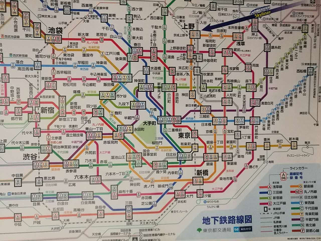 坐SKYLINE到上野后,根据地铁图的指引换乘地铁到新宿。这张的铁很容易看明白,每条线路颜色不同,而且站名很直观,有具体的名称,也有字母和数字组成的代码。