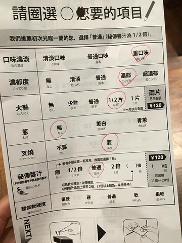 中文单,根据各人需要和口味可以自由选择。这里的格局是一排连座,中间用隔板分开,充分体现了日本不分食的用餐文化。