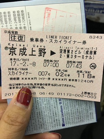 从上野--成田机场的火车票(回程半年内有限),因为去行被回收了,没有拍照。回程票是在入口柜台进行人工换取的,上面标有乘车时间、车号、座位号。