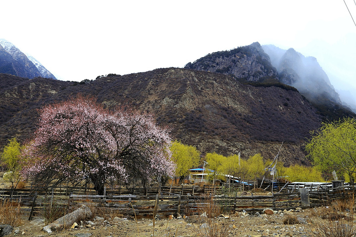 村后有云朵般的桃林,,悠然散步的藏香猪和轻松跑过的马儿,悠蓝透亮的天和雪山…,在静谧悠然的春日里,与我一块的,是同车的一对小情侣,我们没有搭话,但他们的存在让我心安,我想他们也一样感同身受。