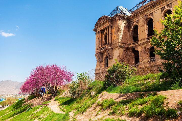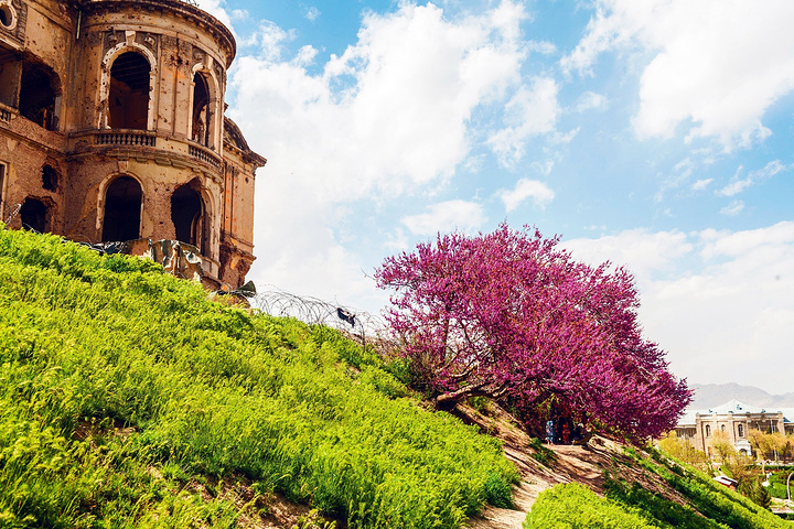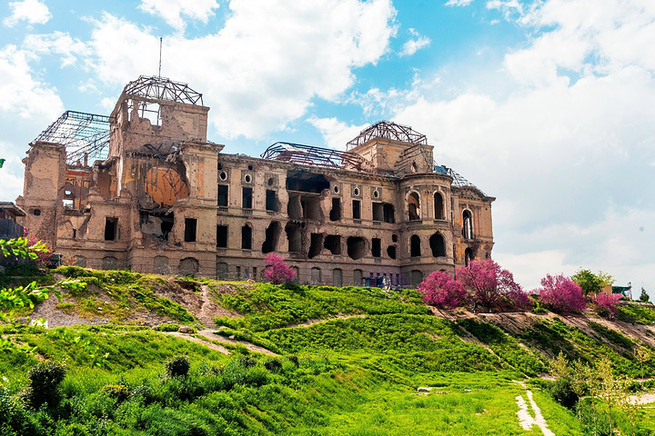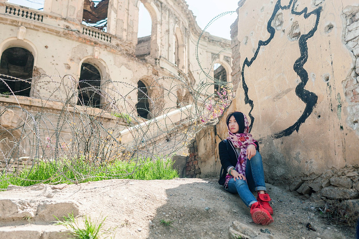 “在那呢,喀布尔大皇宫!”我非常开心地指着前方,因为我在资料上看过这个满腹疮痍的大皇宫,对它算是印象深刻。沿着大皇宫的主要街道两旁的河北岸新城是主要商业生活区,并有皇宫、官邸和住宅。皇宫中有古尔汗纳宫、迪尔库沙宫、萨达拉特宫、蔷薇宫(今称人民宫)等。过去的达尔阿曼宫是议会和政府所在地。城市周围的山峰上屹立着当年抵御外侵的城墙,被称为“喀布尔的长城”。哥哥靠边把车停下让我们下车,他去把车停好在车里等我们。