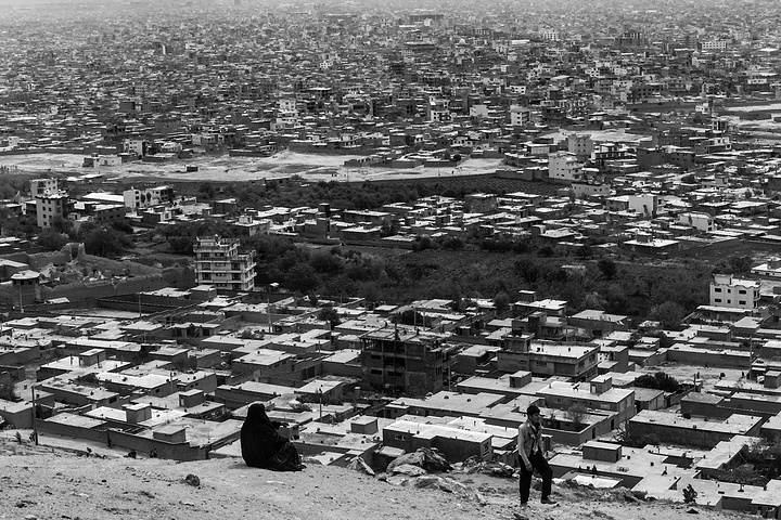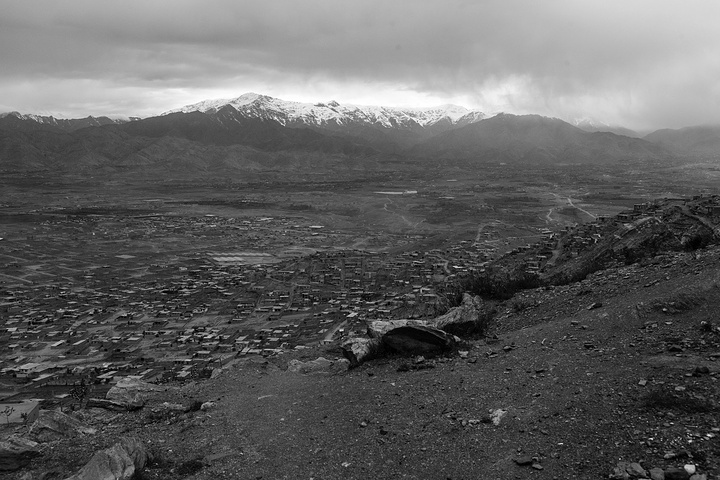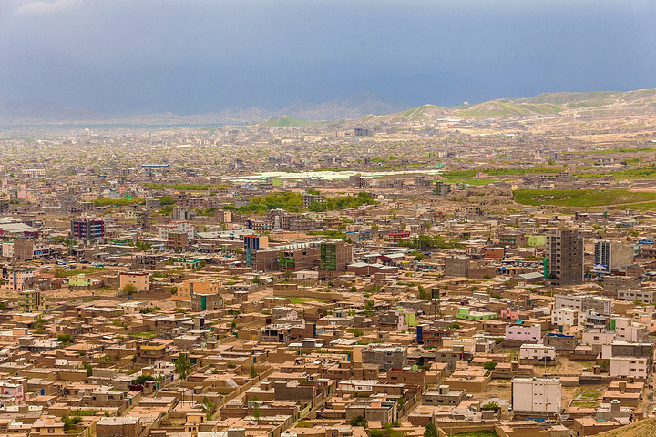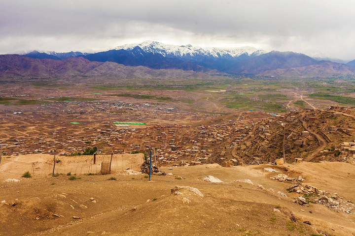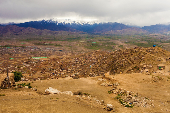 站在山坡上往下俯瞰喀布尔整个城区,满眼密密麻麻的土房子,不高都是小平房,最多三四层,喀布尔的地势在兴都库什山南麓,海拔1800米的高海拔地区,基本上房子都是傍山而建,远远望去的山头上依然覆盖着皑皑白雪。