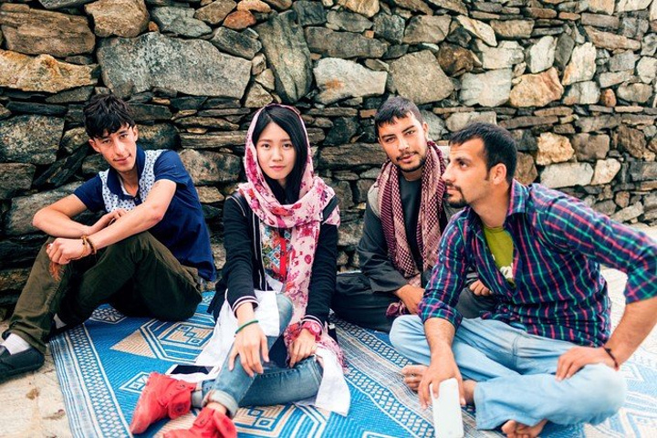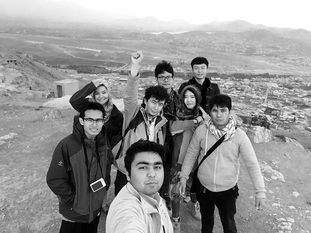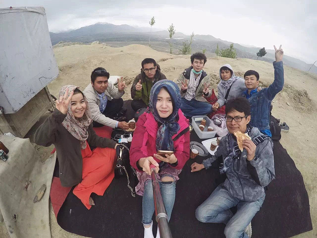 爬上山顶那一刻,有种一览众山小的感觉,山顶有个卖茶水的生意人,他往地下铺一个毯子让我们席地而坐,打开保温壶给我们泡茶,端到手上那一刻,热乎乎的水杯一下子把手捂热,冒气的热气让人心里也暖暖的。更惊喜的是,Fedaee从篮子里拿出馕饼让我们配茶吃点心,这是一大早他的妈妈在家给我们准备的,好让人感动和窝心。那天我们聊天,我们唱歌,我们拿着自拍杆一起旋转,一起在山头拍下集体搞怪的照片,这么一个看起来让人放松的春游,可明明就在刚才喀布尔市中心发生大爆炸呀,真是不怕死不要命的人,按理说应该撤回到旅馆呆着了。