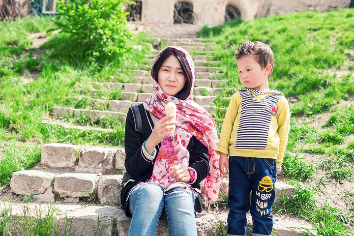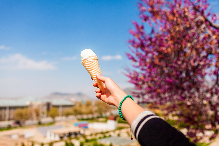 拍完东西,两个小家伙跑到了山坡下了,隐隐约约看见柯南在买东西,不一会儿听见柯南喊我下来吃冰淇淋,我好惊讶,在喀布尔居然有手推车来卖冰淇淋的,虽然品种很少,但是绝对是一个惊喜。自从走了这么一路,吃冰淇淋这件小事吃到了东南亚、印度、斯里兰卡、伊朗、到后面的土耳其、黎巴嫩、约旦、埃及、埃塞俄比亚、肯尼亚、坦桑尼亚、赞比亚、纳米比亚、南非,每到一个国家看见冰淇淋就逮着要买来吃,不过我最爱的是巧克力表皮的冰淇淋~ 拿起冰淇淋对着身后的大皇宫来了个合影,这也是平时吃冰淇淋的习惯~