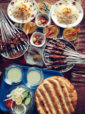 海哥在办事情前,给我们拿来了一个菜单,问我们想吃什么,点好让餐馆送餐来旅馆,没错,你没听错,阿富汗喀布尔很盛行相当于中国外卖这个东西,区别不同的是国内是可以上网自助下单,喀布尔都是老熟客下单,餐馆把餐食送过来。我依然点了阿富汗烤肉配米饭,没办法,最符合中国口味的也只有烤肉,很快,餐馆外送小哥就来了,拎了几个大篮子,把菜一份一份端到桌子上,阿富汗的菜不仅大盘,而且搭配的小碟很丰富,有黄瓜西红柿本地酸奶,配个大馕饼,这顿二十元人民币花的太值了。
