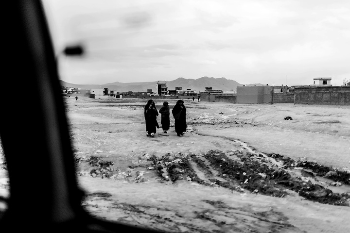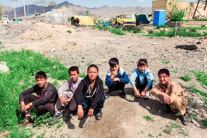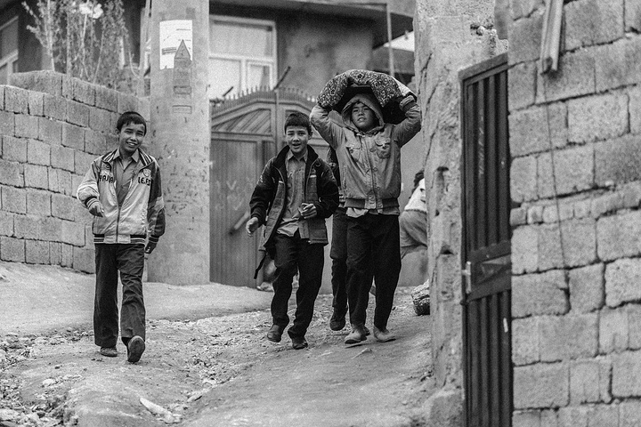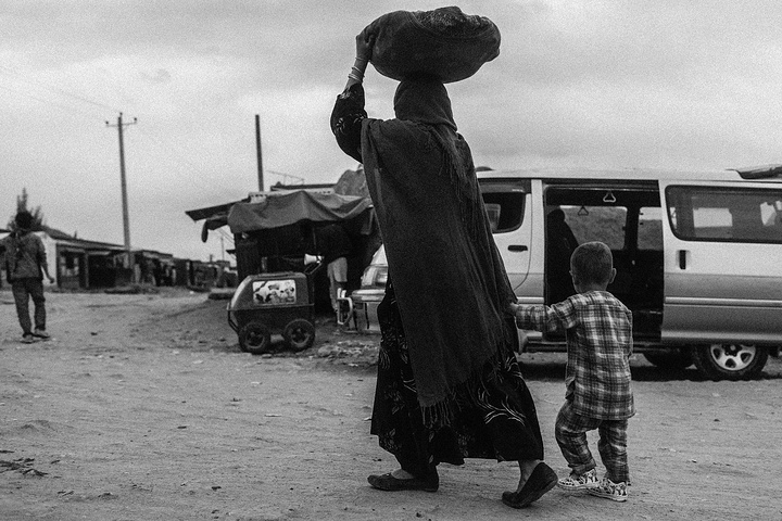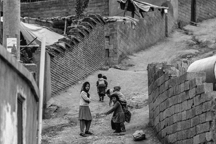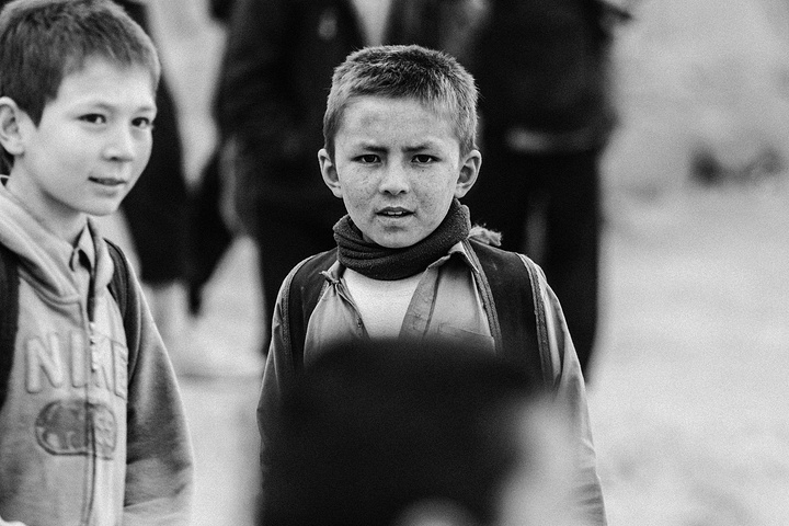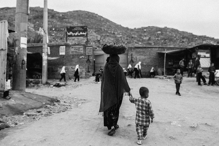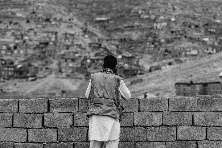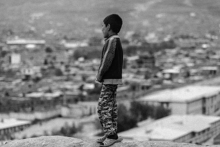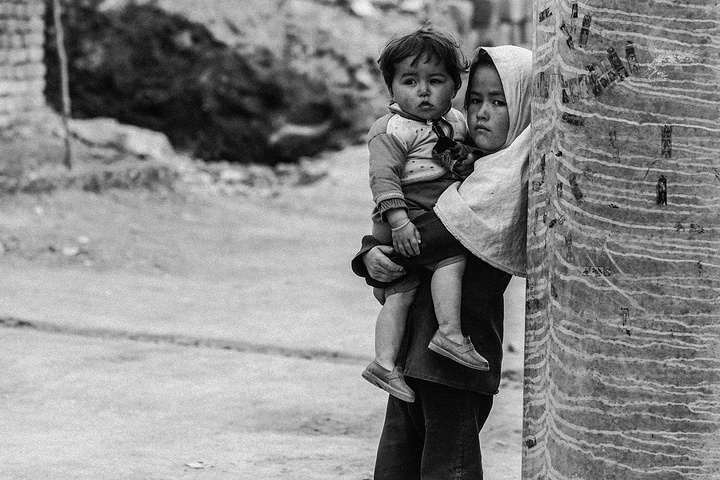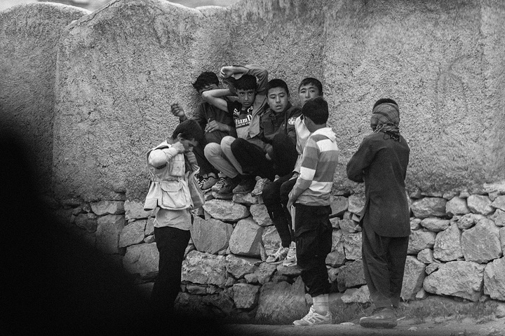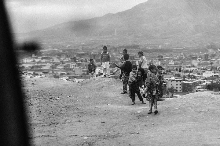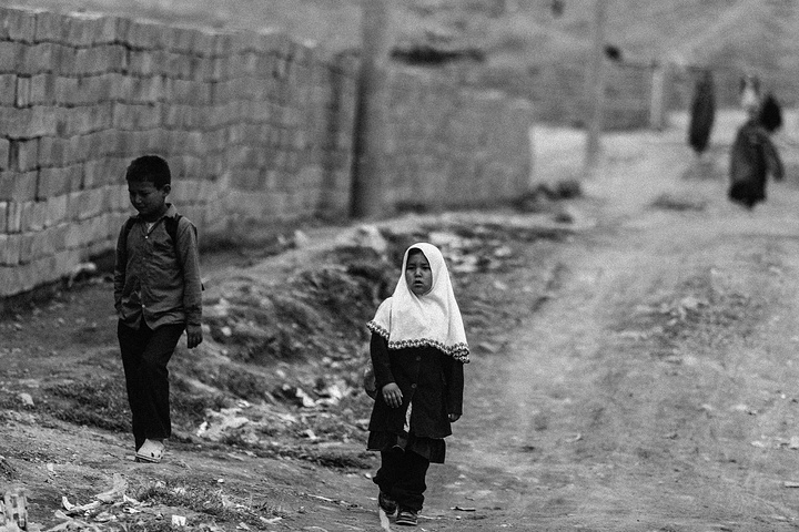我拿着相机记录周围的环境,胆儿大的男孩子都朝着我认真的望着,但我却注意到一个躲在电线杆旁抱着弟弟的小女孩儿,她张望着脑袋看着我,也许是好奇我在做什么,但又不敢凑近看。我走到她的身边,我问她几岁了,家是不是就住在附近,现在有在读书吗,让海哥帮我翻译,她说:“我七岁了,这是我的弟弟,家住在附近,还没有读过书,早晨带弟弟出来走走。”她说完这些,我很能够理解她,因为在这样的贫民窟里,有太多太多这样的孩子了,因为家里穷,自己很小的时候肩上就必须挑起家庭的责任,他们没有童年,似乎有的只是和同龄人一起在家门口走一走。从Fedaee那了解到,有的人甚至一辈子都没有离开过这座山包,没有去过喀布尔城中心,不知道外面的世界有多大。