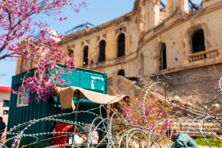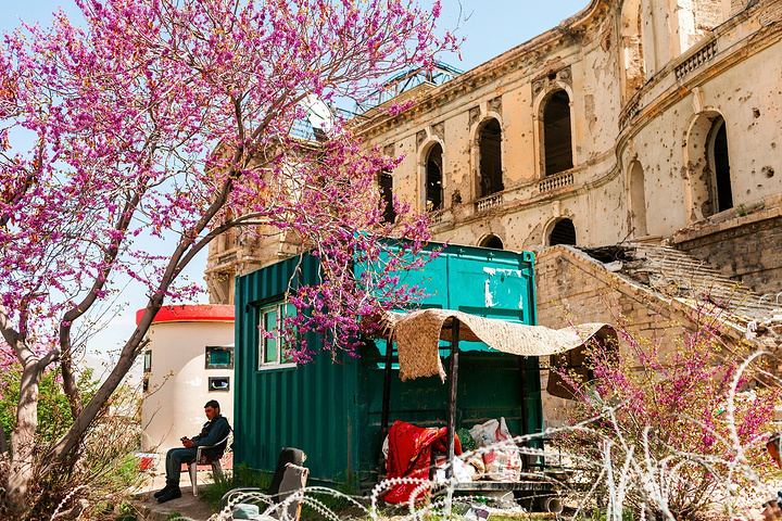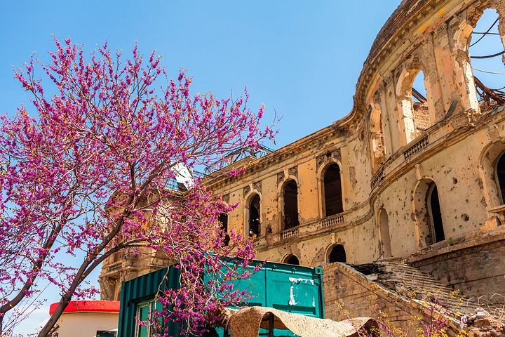 放眼望去,大皇宫矗立在山头上,对于伊斯兰教国建造穹顶的实力,这里一路从伊朗开始参观的每一座建筑,穹顶都是堪称完美,细致的手工绘墙,五彩斑斓的线条,都在印证着伊斯兰建筑的伟大,但是眼前这一幢被炸得面目全非的废墟,原本每扇富丽堂皇的大窗台都已经炸的空空荡荡,表面的墙体经过日晒风霜也都全部脱落,展现在人们面前的就是一幢具有规模的建筑,看得出来曾经这里的场地很庞大,能让人自行想象的空间很丰富。