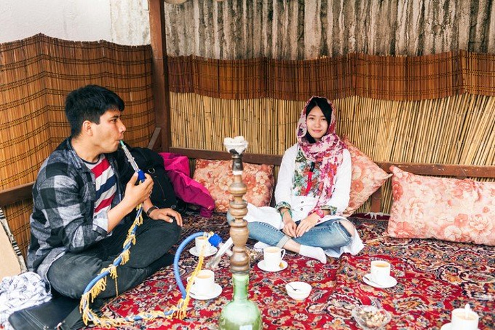 院子外是一条喀布尔的河流过,院子内的花花草草,清新雅致装修的房子,让我越来越喜欢这里,可以在这个院子里面放松地与朋友们聊天吃饭喝茶,海哥跟我介绍这家文艺的咖啡茶馆在喀布尔的文人圈里很出名,一般文人诗人都爱来这家店做交流抽水烟吃茶点,去年点亮巴米扬大佛的270张昕宇梁红也来这家店玩过,仔细一看,周围桌上坐着都是是阿富汗新一代的文人墨客,穿着西装打着领带带着公文包,据说这家店的老板娘是个独立新时代女性,人在外地工作,开这家咖啡茶馆的营业收入都是用来帮助阿富汗难民,一生致力于公益事业,这让我非常的敬佩。