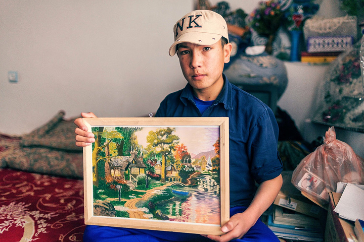 柯南跟我介绍这个大侄子画画天分太高了,转身从角落的白布下拿出大侄子自己画的油彩画,精致的的油彩画被画框小心翼翼保护着,看到画时,我惊讶地说不出话来,作品太棒了,一笔一划都带着饱满的情感,画中描述着一个宁静的世外桃源,每家都是田园式房屋紧紧有条地错落着,树林郁郁葱葱,林间小道旁的小溪缓缓地流着,很温暖地向人们表达着自己对于和谐幸福家园的渴望,而阿富汗目前的现状却是战火累累,破旧的房屋大多都是被炸毁的废墟,直立的房墙上布满着密密麻麻的弹孔。这幅画在中国乃至其他国家是一个平常的社会状态,而在阿富汗这样温馨宁静的生活环境却是一种奢侈。但在大侄子的画笔下,这是一种信仰,一种精神寄托,是一种相信未来,相信生活会慢慢好起来的信念。