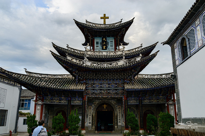 从人民路穿过一条名为新民路的静谧的胡同,步行100米左右,可以看到一古朴中融合着白族建筑艺术风格的教堂——圣三堂,整座建筑飞檐斗拱,彩绘娟秀,蜚声海内外,吸引着世界各地的教友和游客慕名前往游览参拜。只是此次前往的时候,恰逢教堂院内绿化施工加之非礼拜日,所以人比较少。