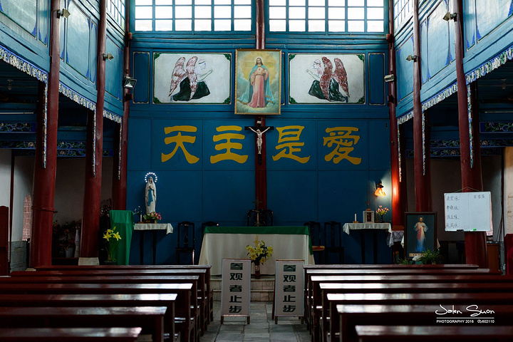 教堂内部装饰并不像西方教堂那样豪华,但是雕梁画栋,具有浓厚的白族建筑风格,整体非常的庄严肃穆。