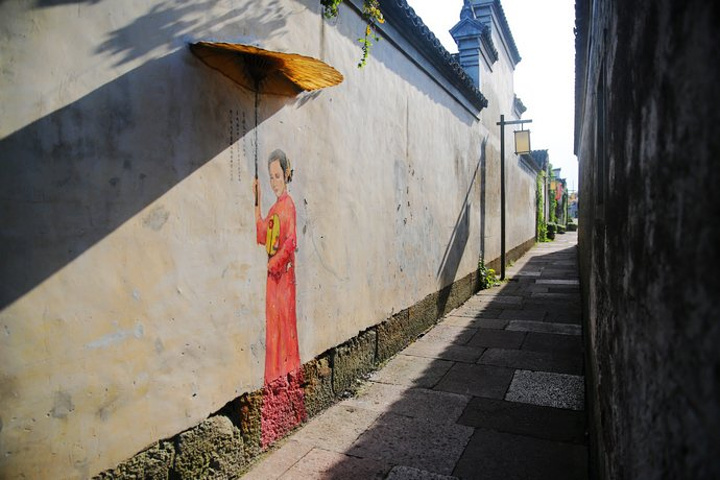 忽而,街道中间睡着的小狗被我的快门声惊醒,朝我一阵狂吠。江湖餐厅前堆放的酒坛,墙面上人物的潇洒画像,让人恍如置身于一处隐居江湖。