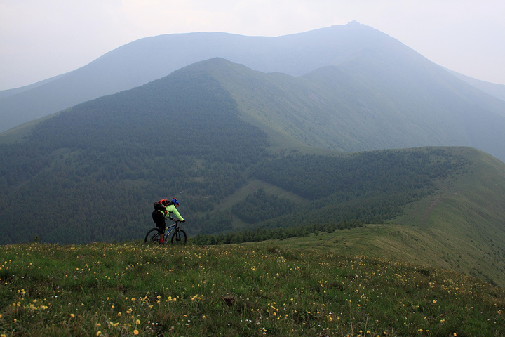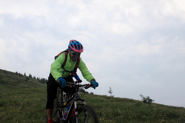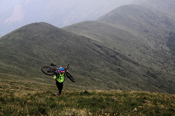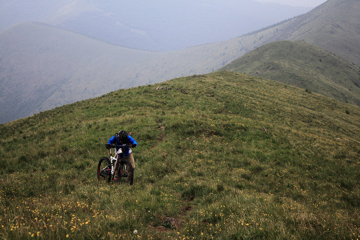 沿山脊的推进有苦也有乐,经过一段艰苦的推车,一片宽阔的下坡出现在眼前!大家纷纷上车~