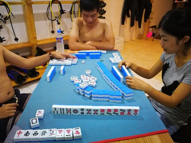 回到潜店,记起老板说店里有麻将,只是桌子没有弄好。但我们怎么能这么轻易地放弃发扬国粹的机会呢?没有条件也要创造条件,于是,和同在潜店的其他小伙伴们在国外打起了麻将……
