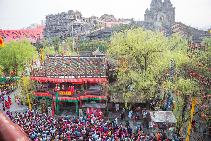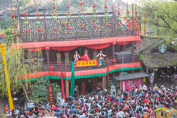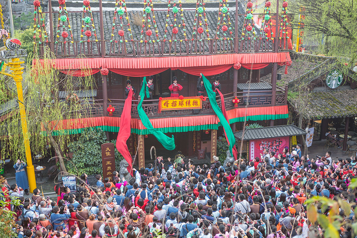 这个王员外奉旨嫁女,特开彩楼为女儿招婿,据说抢到绣球的游客不仅可以跟王家三小姐拜堂成亲,还可以骑高头大马游宋城一圈,并得到特别的纪念礼物。所以大家可以注意到,有想出风头的成年男性,都会排队到正下方,然后抢那个绣球。