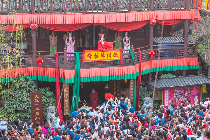 参观的众多人们站在那里经过长时间的等待,在广播N遍的演出马上开始声中,终于王员外夫妇两人出来了,说了一通奉旨嫁女的话,让家人将王家小姐请了出来,但见那王家小姐在丫鬟的簇拥下走到楼台前,看了又看,将手中精致的绣球向意中人抛了出去。