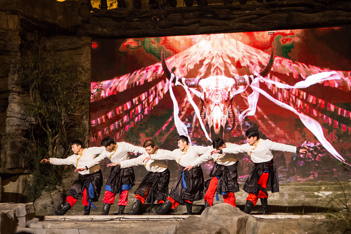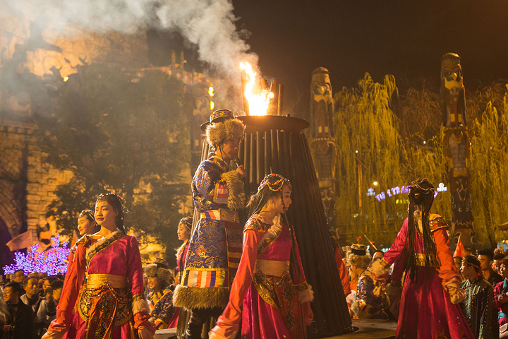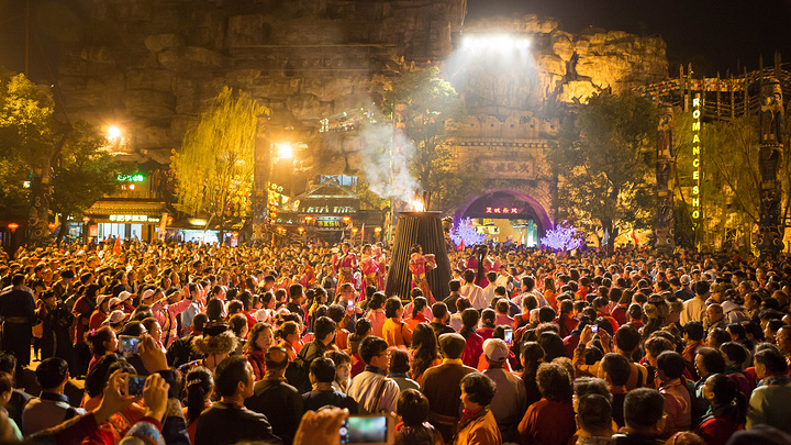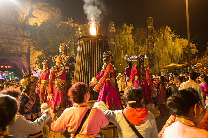 吃过晚饭后,景区里依旧热闹非凡。在中心的大街上,一群人围着篝火,跳起了舞蹈。