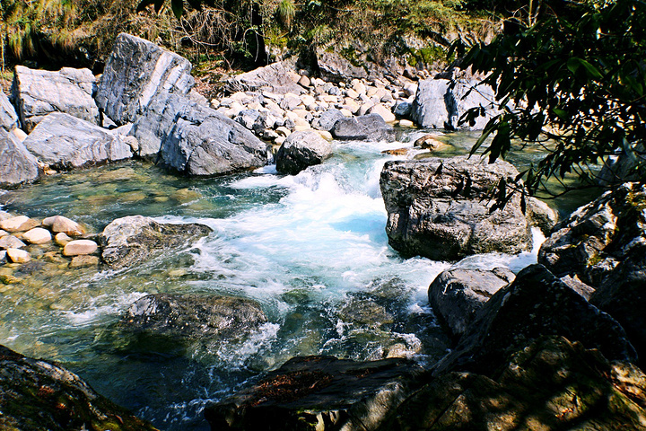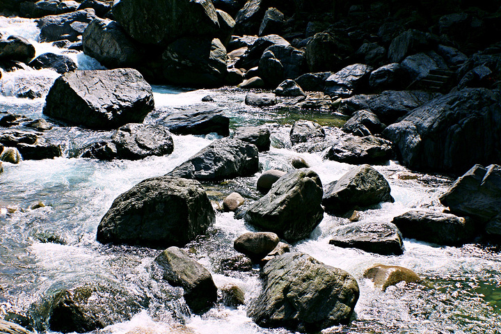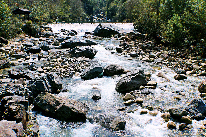 龙门潭。两山对峙,可望而不可及,其形如门,相传是牯牛降里的龙王出入之所,所以称“龙门”。龙门高88米,宽20多米,两山夹峙的峡谷就叫龙门峡,纵深100多米。脚下流淌的水便是龙门潭,河谷中巨石翻滚蜿蜒千米,又被称为滚石滩,游客穿行巨石之间,可以走近细看形态各异的石头和奔流于巨石丛中的清泉。其中有三块隔河相望的巨石,当地人叫“三隐笑谈石”。古代有不少读书人看不惯人间冷暖和江湖的险恶,不愿随波逐流,于是寄情山水。其中就有三位隐士经常分坐在这三块巨石之上,“笑谈古今事”,这石头也就因此得名。