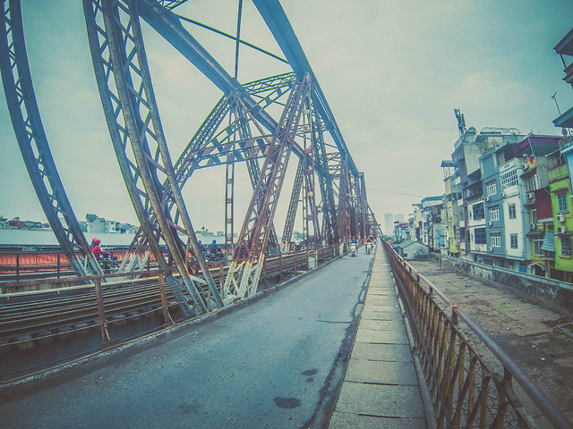 这座桥全程可能有好几公里,而刚好我们就要通往河的另一面,拖着箱子在这个桥上有一种想死的冲动,讲真太远了,路还不好走,看楼主所站的位置,脚下每一块板子连接处都有一条缝隙,这使得拖箱子更加困难。