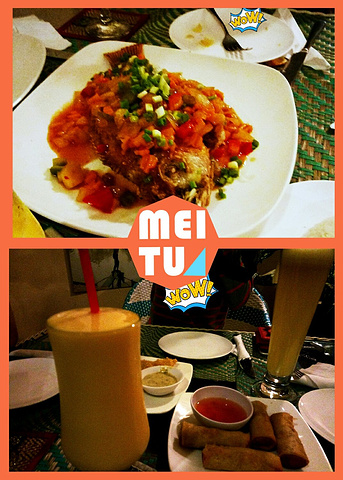 晚上看完日落回到酒店,微信联系拼车的妹子,她们说太累没去巴肯山看日落,约好7点半在Genevieve's Restaurant聚餐。这是一家公益性质的餐厅,老板妻子的名字命名的,为了纪念因癌症去世的妻子,以培养当地残障青年为主。和一般的暹粒餐厅一样都是点主菜就配饭的模式,因为人多尝试了几款推荐菜:炸虾、炸春卷、酸辣鱼、咖喱鸡肉都挺好吃的。席间还看到了老板,一个和蔼的外国老爷爷。