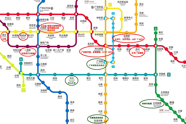 为了方便大家,特意标注了文中提到的景点所在的地铁站,红色标注的隶属天河、越秀、荔湾三区,也是最近去的地方。绿色标注的是以前去的。需要注意的是,市区的地铁站非常密集,因此同一个景点可能离两个地铁站都很近,例如到北京路,坐地铁到公园前和北京路都可以。