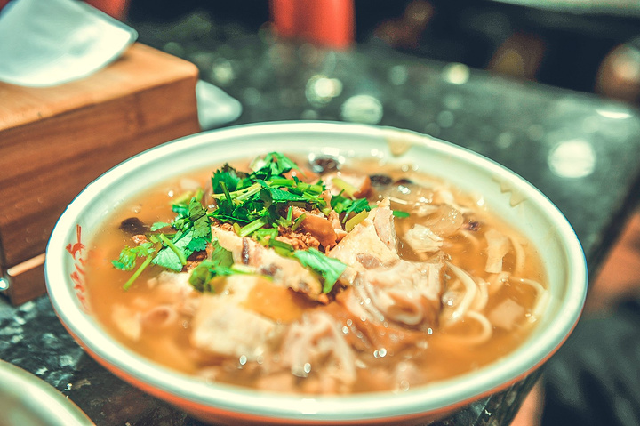 卤面是漳州最有名也最受欢迎的早餐,看似简单实则在细处下了很对功夫。漳州卤面和其他地区卤面最大的区别在于它的面是加了碱的粗面,闽南的面条食物基本都以碱面做底。用碱水做出来面饼清爽弹牙,稍带一点涩味,不宜吃水,味道特别。面用热水焯开之后沥干加入汤底内,然后由食客自选后续添加的辅料。辅料有:猪皮,猪大肠,猪肺,壳子肉(横膈肌),笋干,豆干等。