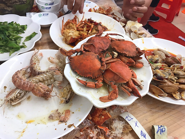我们是先去小胡子加工店让店员带我们去买海鲜再拿回去加工,自己去很容易被宰……一进到里面人多得要命!我们基本就是人家带我们直接去买完了直接出来!没逛!如果吃的人少,一定悠着点儿别买多了!2个人连海鲜带加工费差不多400快一顿~