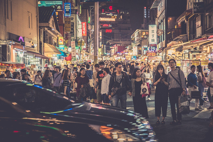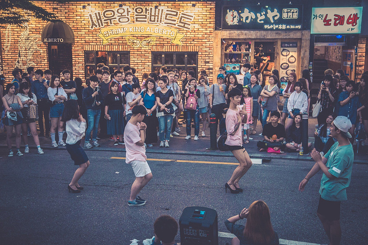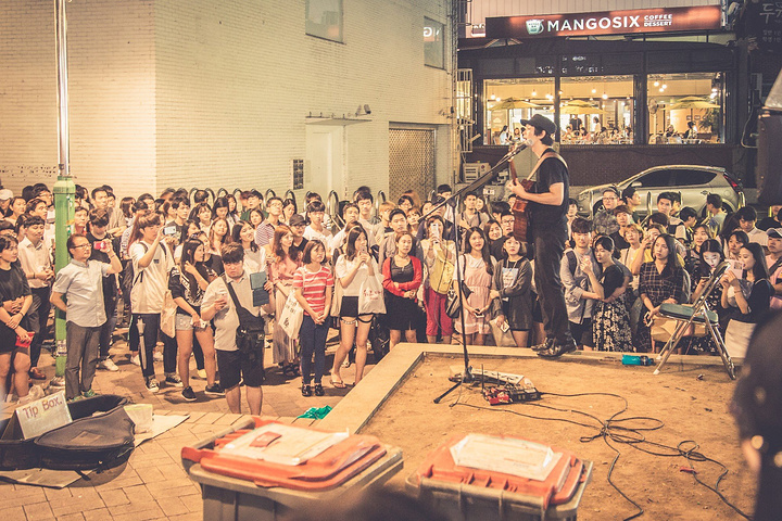 不同于明洞,这里学生明显更多,主要年龄层看起来像在十几岁二十几岁的样子。穿梭街道中,可以看到很多精致的小店、咖啡厅、餐厅、酒吧。当然更好就是不进去,找个地方听听歌、看看热舞,才符合青春的气氛。特别提到的是,这里很多卖衣服的小店,价格很便宜,样子也不错,差不多也都可以退税和刷卡,不妨逛逛。