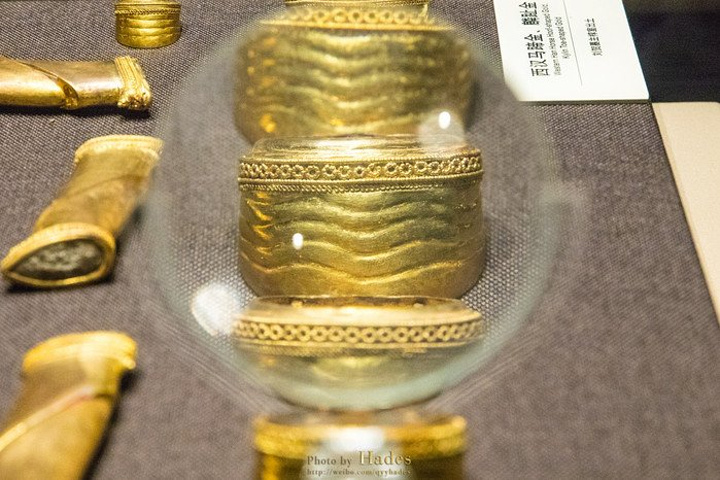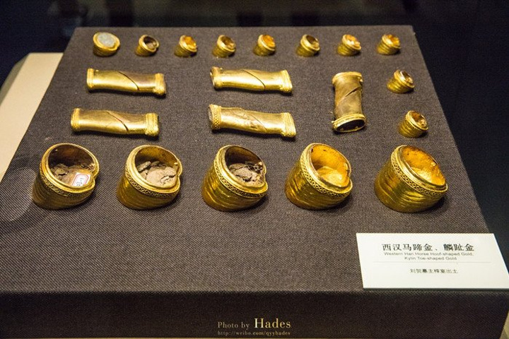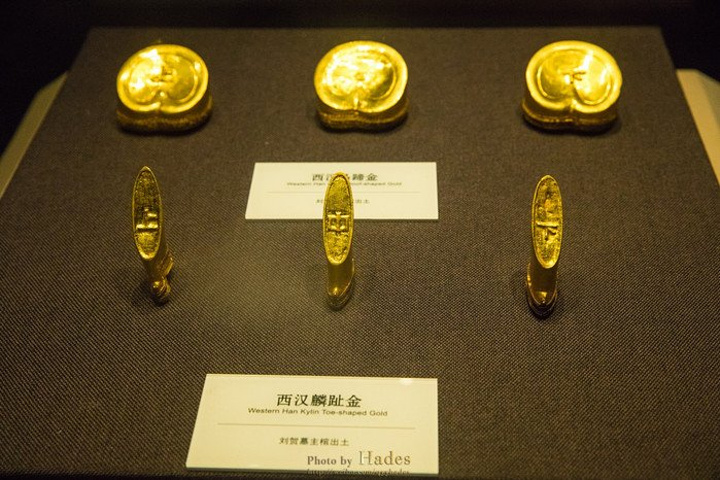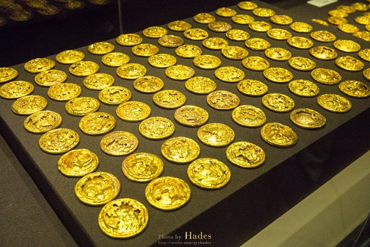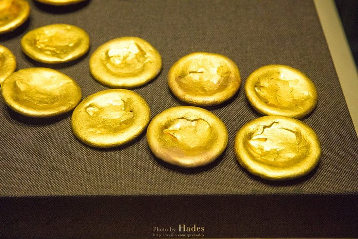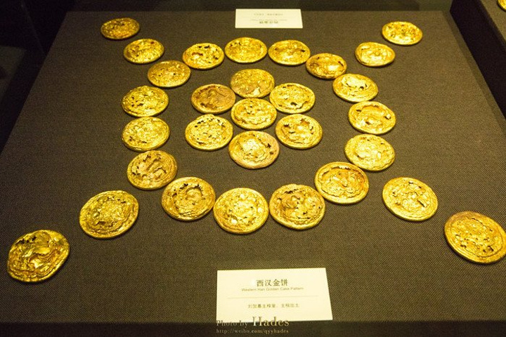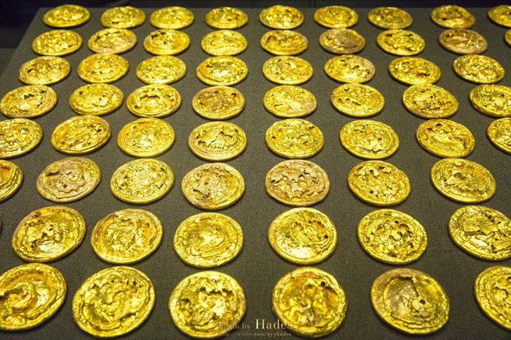 这些金饼大的重250克,小的重50克,有几百枚之多,是汉墓中出土金饼最多的。这些金饼并不是实心的,而是中空的,可以清楚的看到金饼被压扁,被挤压的地方也有金饼碎裂的痕迹。