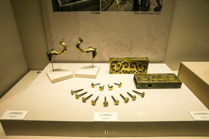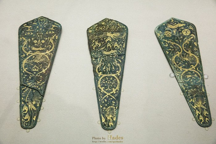 这几个鎏金铜片是马身上的装饰。