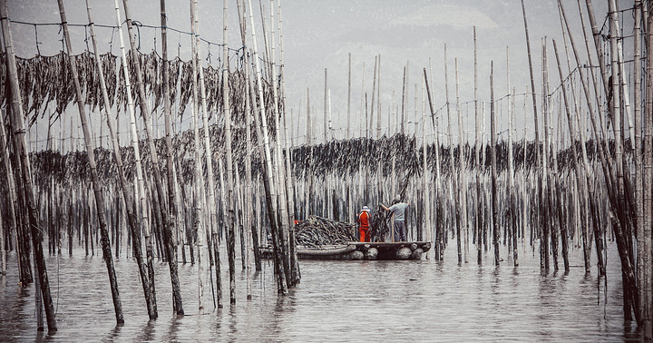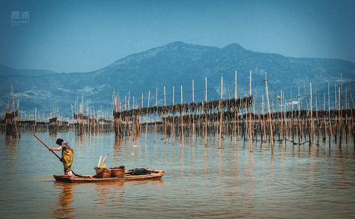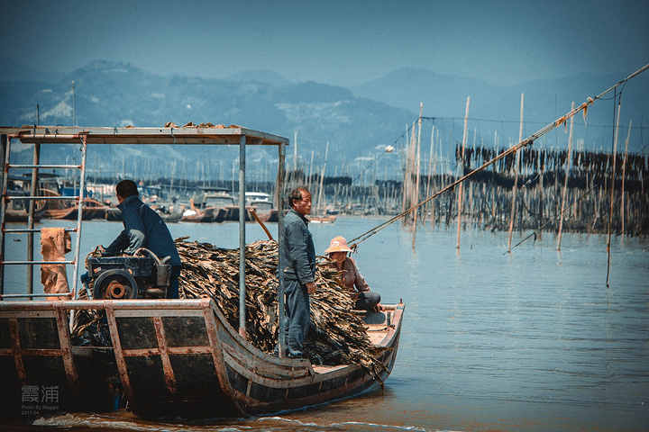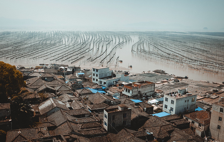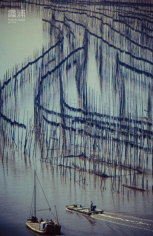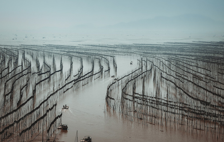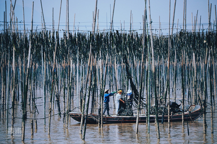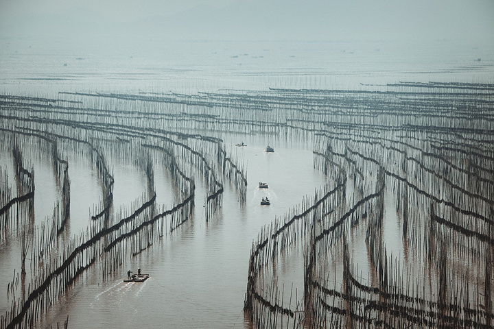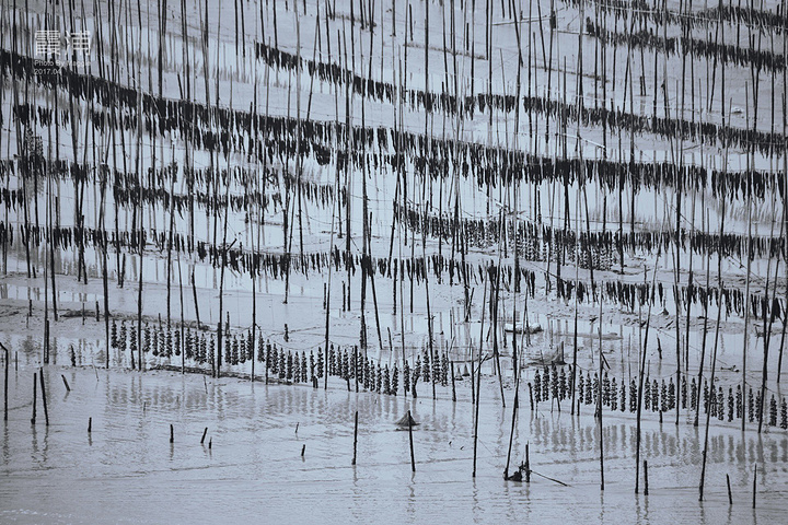 沙江是唯一一个可以在中午拍摄、为数不多的适合高光拍摄的地点,距离县城约20公里。众多插在滩涂上的竹竿形成的优美线条,错落有致地排列在“S”形的港湾水道两边,构成一幅完美的滩涂风景。每当海带收获季节,来来往往的船只,在竿影间繁忙穿梭,水墨韵律更加美妙突出。