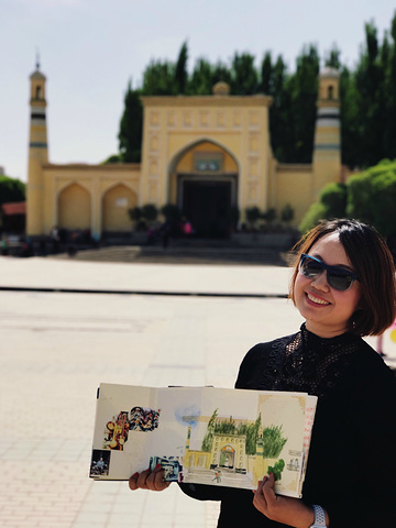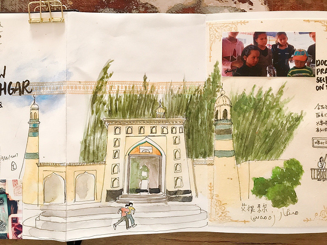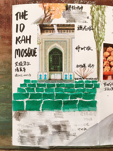 古城的核心是Id Kah清真寺,清真寺前的广场上,各种旅游纪念照摊位的中间,我们在一个小冷饮铺对面坐下,拿出手帐。在正对着清真寺的地方画着速写、喝着3块钱的可乐,还有一群维族孩子围观一个多小时,最后请围观的小朋友帮我写下清真寺的名字。