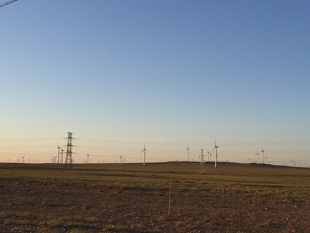草原上最多的就是那些一排排的风车和高压电线架, 还有一群一群的羊群、马群,还有一些零零散散的骆驼,满地零散的石头,还有风滚草(戈壁滩上常见的,一种搞笑的会飞的植物),也叫草原流浪汉 。