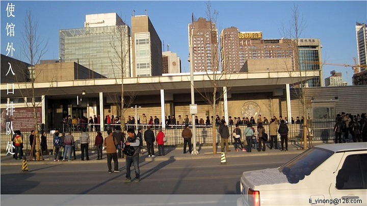 如下图,先排审查材料D-160的表格之类,按照预约时间排队进入使馆围墙内,注意单向通行的,在使馆内的大门进行材料最终确认检查和安检,电子的东西、水、手机一律不准携带进去。