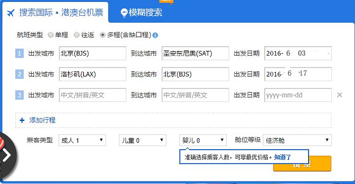 不算成功的订票,出发在广州机场呆10几个小时,在洛杉矶一宿,回程自广州机场回北京是第二天凌晨。后来发现,我美国时间17号(周五)在洛杉矶,出发时到广州已经是北京时间18号(周六)的下午,从广州回到北京是19号(周日)4点,然后我这个石化,谁要你便宜呢!?