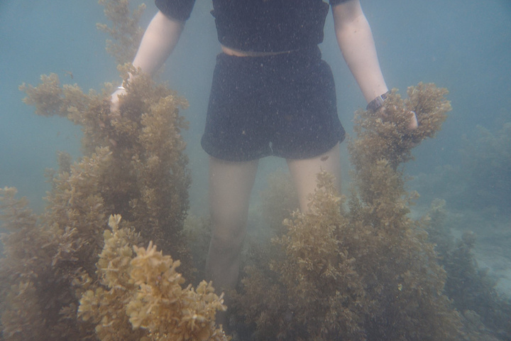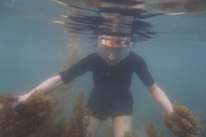 梁哥找到浅一点的地方多海草的给我站着帮我拍照,但是在水里水的流动大根本就站不稳,也没有平衡,就算抓着海草也是下不去,特别是把救生衣脱了