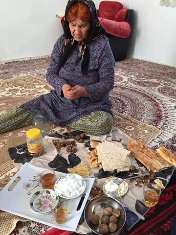 第二天上午,小伙子的奶奶为我们准备好了早餐,有酸奶,馕,核桃,奶酪还有茶,用馕夹着剥好的核桃仁再加入一点奶酪一起吃,很美味。