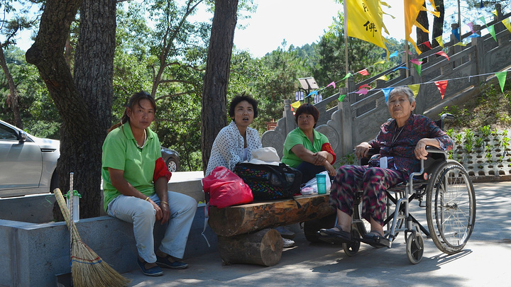 紫峨寺景区观音广场,树阴下坐着穿绿色T恤衫的两位大姐,是景区工作人员。在我徒步栈道,母亲独自停留期间,他们主动陪老人聊天,拉家常,甚至还搀扶着去了趟厕所。让人十分感动!