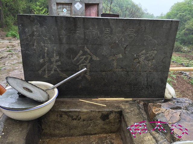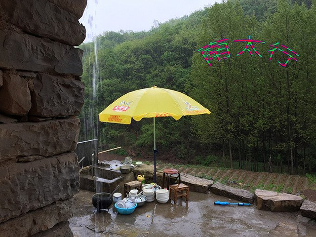 雨势加大,哗哗的顺着屋檐冲向地面,中午饭的餐具摆在雨中的山泉水管边。院外的山泉聚水池可以补给驴友充分的水继续前行的生命之水。