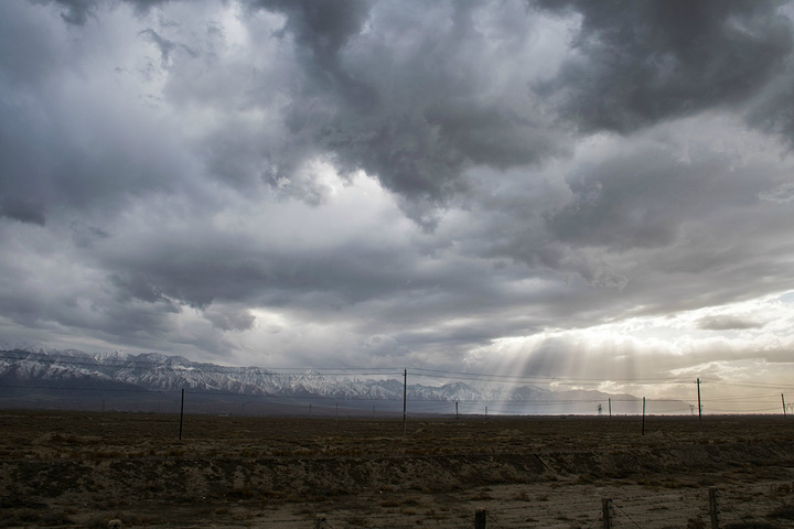 今天的任务是赶往嘉峪关然后折返回张掖七彩丹霞,行程有点长。10点接到华仔后便驶入连霍高速(整个行程中不多的两次上高速)。民乐以北和民乐以南是两种完全不同的景色,昨天一整天的荒草地和光秃秃的冲天杨,今天的镜头中却充满了色彩。一路上远处覆雪山脉、近处村舍人家再点缀几颗开满花朵的桃树——俨然一幅藏地江南的景象。本想回程再停车拍照、怎想天气会变成这般景象。