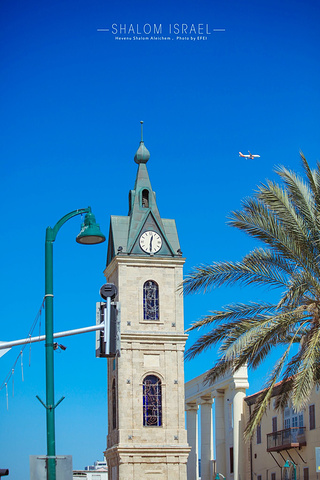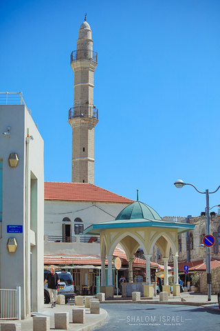 雅法古城建议先登上山坡顶上,从上往下来逛,车子可以开到上面,然后步行穿梭在古城里最后下到古城的钟楼广场上。这里可以看到有着蓝色塔顶的是雅法港口的老灯塔,后来被改造成为清真寺宣礼塔。